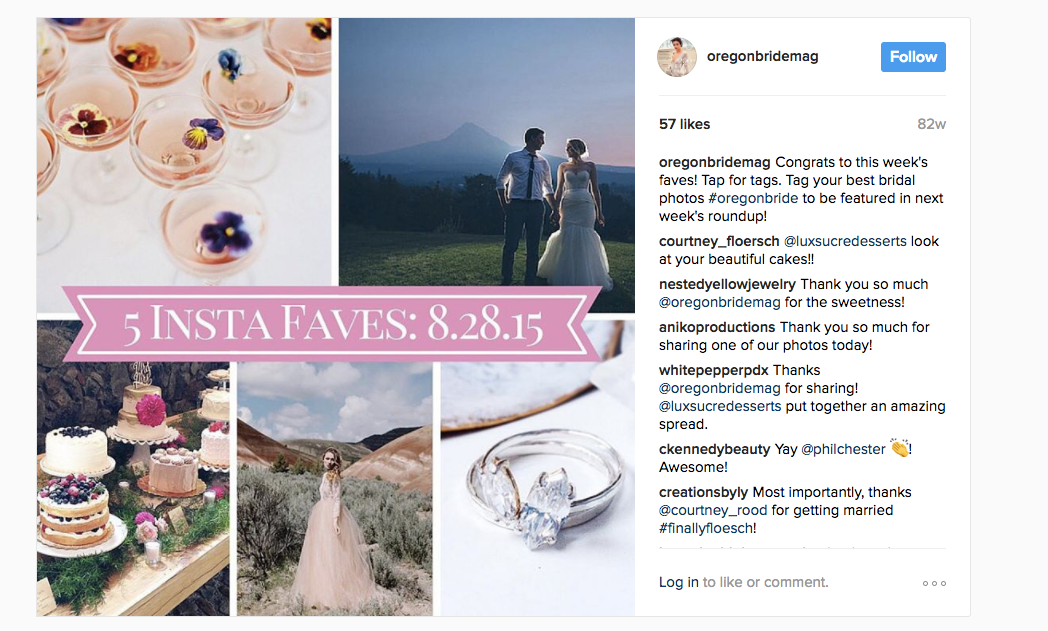 I created a weekly Instagram feature highlighting 5 outstanding photos that had used #oregonbride in the preceding week. This feature generated unprecedented engagement with the branded hashtag, built affinity and positive sentiment for the brand, and helped secure strategic partnerships with vendors we chose to highlight. Oregon Bride’s Instagram following grew from 300 to over 2k while I was managing the page, and #oregonbride hashtag use increased 400% after launching this content series.